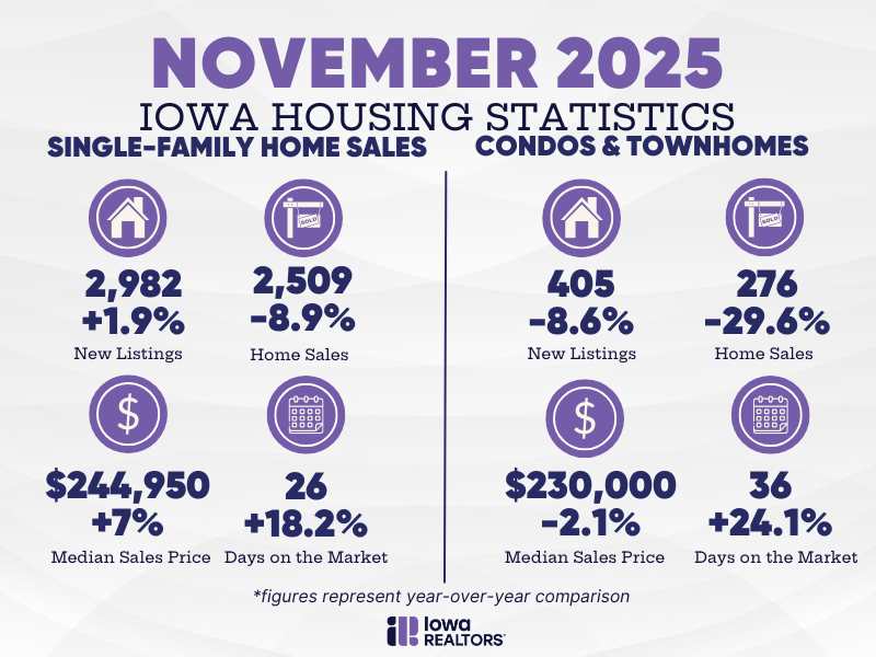 Iowa’s housing market wrapped up December on steady footing, with healthier inventory levels and sustainable price growth pointing toward a more balanced start to 2026. While late-year activity reflected typical seasonal slowdowns, year-over-year gains in listings and closed sales suggest the market is stabilizing and regaining its rhythm. Together, these trends signal renewed momentum and a stronger outlook for buyers and sellers heading into the new year.